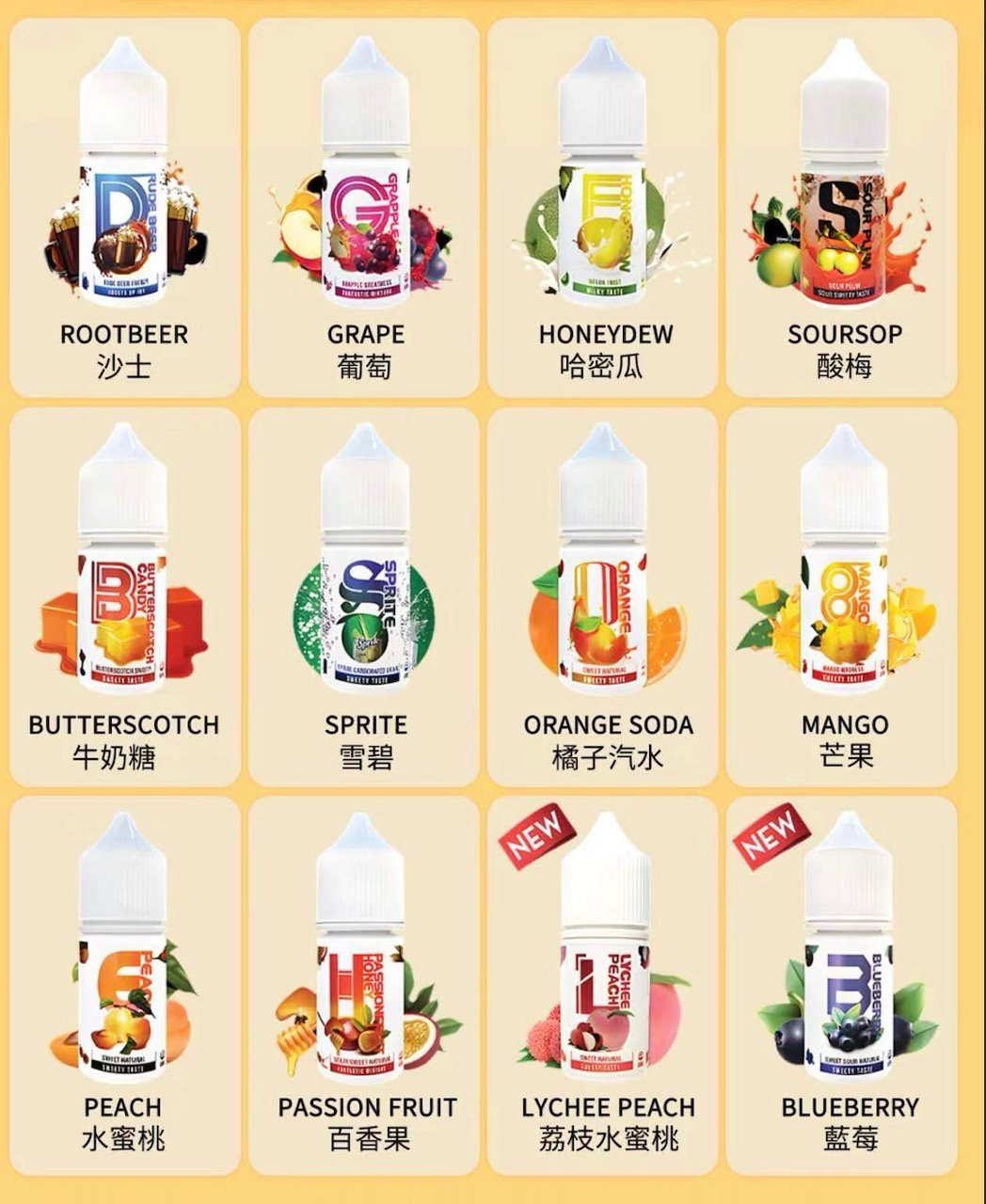 | LHVAPEMY | 水蜜桃荔枝, 水蜜桃, 藍莓, 沙士, 酸梅, 芒果, 雪碧, 哈密瓜, 牛奶糖, 蜂蜜百香果, 蘋果葡萄 |